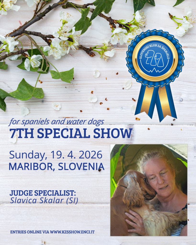 Tudi letos Slovenski klub za španjele organizira v Mariboru 7. specialno razstavo za španjele in vodne pse, in sicer 19. aprila 2026 na znani lokaciji, Dajnkova ulica 4.